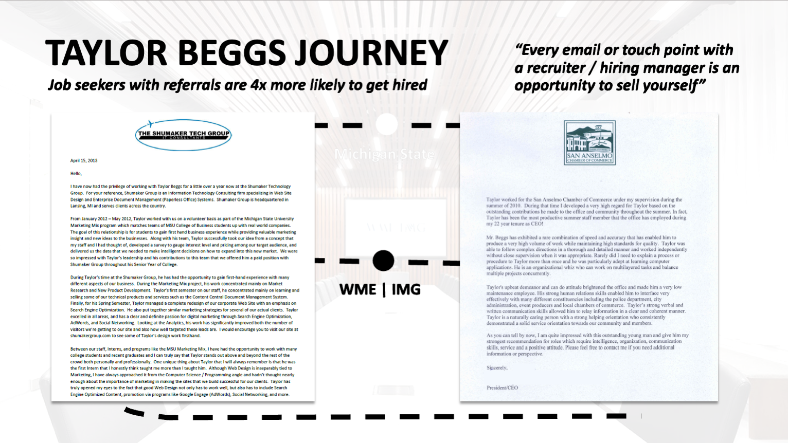 In addition, the summer internship I was able to land came as a result of two factors: 1. the Study Abroad program, as two of the employees were in the program as well and they referred me internally 2. the MSU Marketing Mix program which is an organization that matches College of Business students up to consult with real world companies in order to gain first-hand marketing experience. After one semester, the President of the company was impressed with the work I produced and hired me on as Director of Brand Strategy and Communications. I ended up working there for a year and a half while balancing being a full-time student and upon graduation received a Letter of Recommendation which would help me land my next couple of jobs.