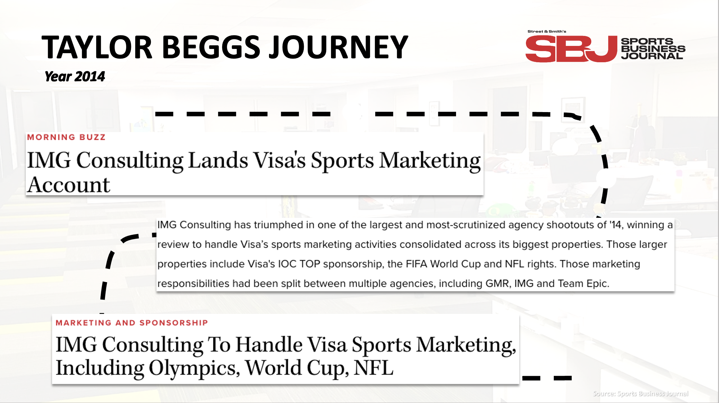 Interestingly enough, just a couple days later, the Head of the West Coast, without going to him yet to ask him to mentor me, posted a new position to work for him as an Account Executive. At the time, I was an Account Executive already so was unsure if it made sense to make a lateral move, plus I would have to commute down to Foster City a couple days a week which would be a brutal 1.5 hour commute each way. 50% of my time would be reporting to the Head of West Coast at WME | IMG, the other 50% to the Head of Olympics and FIFA at Visa. As you can recall, I already felt like I was in a dream and I didn't want that dream to end. And so, I couldn't imagine there being another job that could be better than what I was already currently doing.