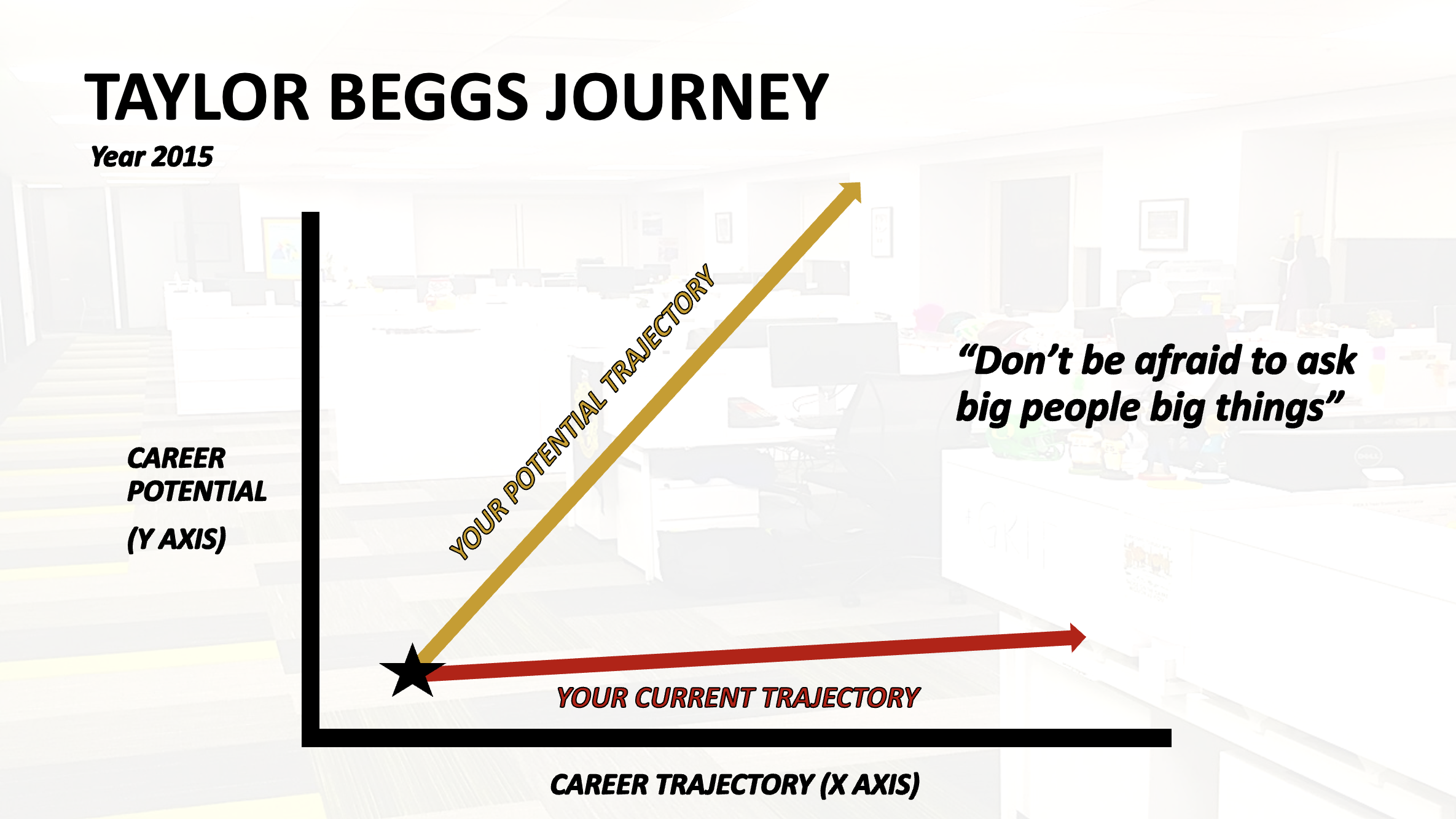 The following week we had a lunch interview and towards the end I was still a bit hesitant and asked him, “if you were in my shoes, is this something you'd go after?” And this person said, Taylor what you're currently doing now - “you're going like this, and he used his finger to show this gradual increase of a straight line. And he said, Taylor, if you work for me, you will go like this,” and he showed this direct, vertical shot up (exactly the same as illustrated in the graphic above). At that point, I was like, Holy Crap! This is exactly what Eric Harr had just told me a week ago. So at that point, I thought to myself, this is it. This is even more of a dream job I never could have imagined. The stars were completely aligned and there’s a thing called the ‘Confirmation Bias’ where your mind, once you make a decision, prioritizes its attention consciously and subconsciously to life occurrences that reinstate and confirm your beliefs and that’s exactly what started to happen with the signs that were showing up.